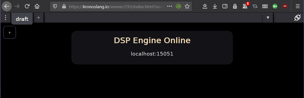 Launch Veneer by going to [https://kronoslang.io/veneer] or opening your local copy. Switch to the local compile server by appending ?srv=localhost:15051. If you run over the network or use a different port, please change the parameter accordingly.